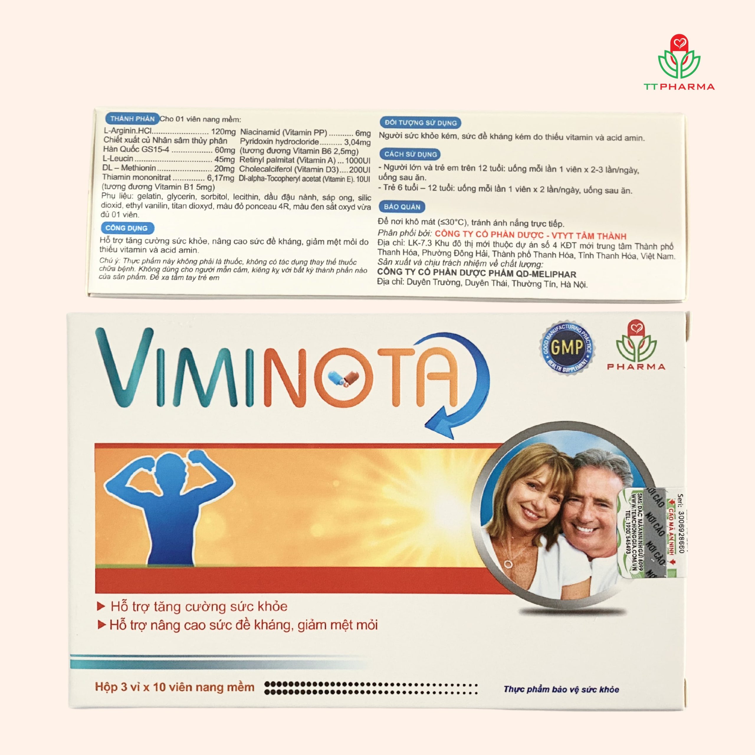 Viminota đem lại tác dụng bổ sung dinh dưỡng toàn diện cho người ăn kém, mới ốm dậy, phục hồi sau phẫu thuật. Là lựa chọn tin cậy giúp bổ sung vitamin, acid amin thiết yếu, hỗ trợ phục hồi thể lực và tăng cường sức đề kháng cho cơ thể.